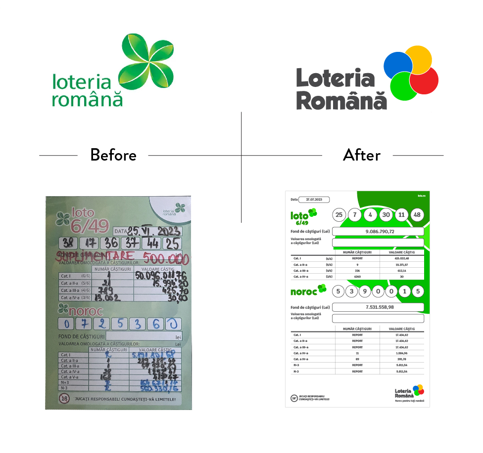 “We were honored to have the opportunity to collaborate with Loteria Română, a company with a history of 117 years. Each of us who worked on this identity project grew up with the lottery and sports betting, and we all have happy memories and stories related to Loteria Română. Many Romanians have had their lives changed with the help of Loteria Română, and many others have enjoyed playing. The new promise, ‘Luck for all Romanians,’ speaks about the impact of the Lottery on people’s lives: players’ money returns to society, while the visual identity evokes the institution’s digitalization.